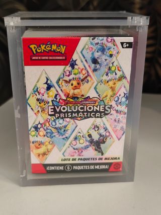 Pack de mejora de cartas Pokémon, colección Evoluciones Prismáticas. - Contiene 6 paquetes de mejora. - Juego de cartas coleccionables Pokémon. - Edición en español. Se incluye el acrílico