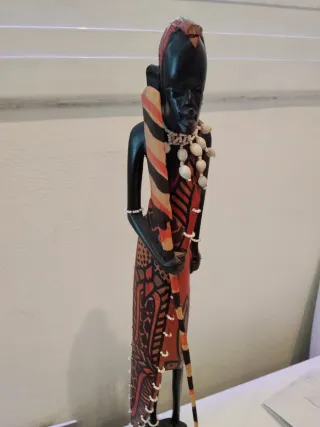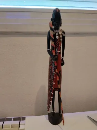 Figura decorativa de madera tallada con detalles pintados y adornos. - Figura de persona africana. - Pintura en tonos rojos, negros y ocres. - Adornada con collares de cuentas y conchas. - Incluye un bastón o lanza decorativa. - Mide 47cm.