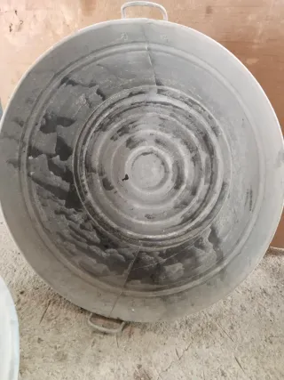 Barreño antiguo de chapa, con un diseño circular y asas laterales. - Material: Chapa metálica. - Diseño: Circular con asas.