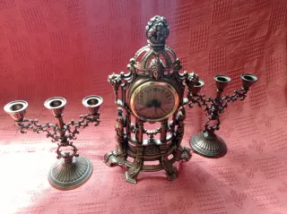 Conjunto de reloj y candelabros con un acabado dorado. El mecanismo es de pila de las gordas. Uno de los candelabros está reparado con soldadura en frío, por lo demás todo perfecto. - Diseño ornamentado. - Incluye un reloj de sobremesa y dos candelabros. - Ideal para decoración.