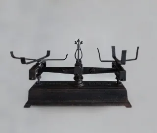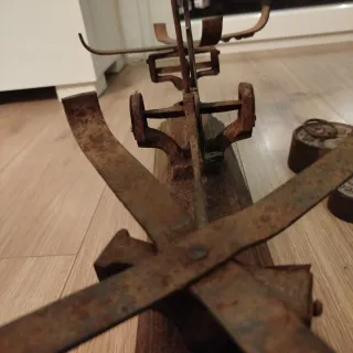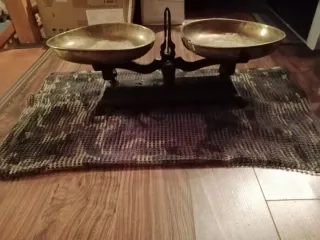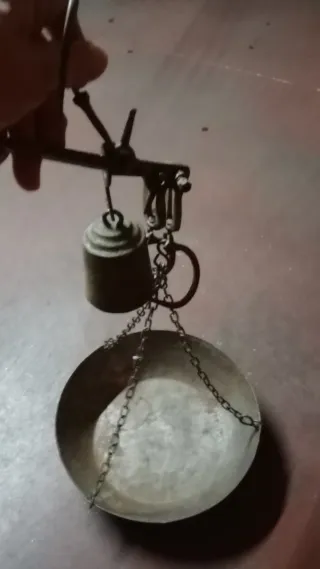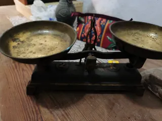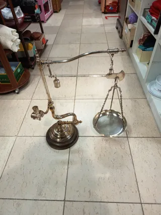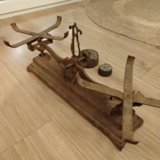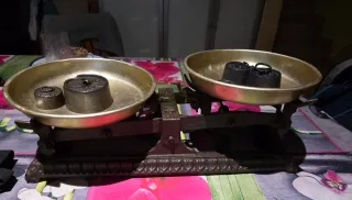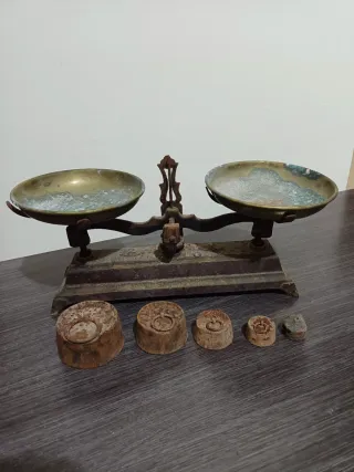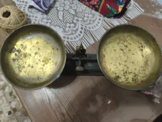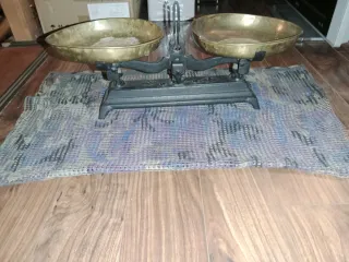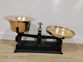 Balanza antigua con dos platillos de latón y base de hierro fundido. Ideal para coleccionistas o como elemento decorativo. - Platillos amplios. - Mecanismo de pesaje visible. - Base robusta y ornamentada.