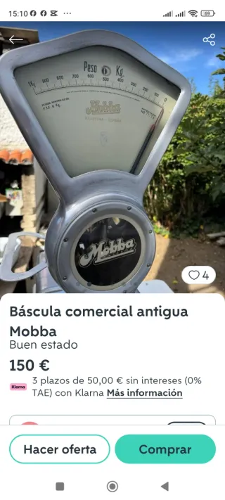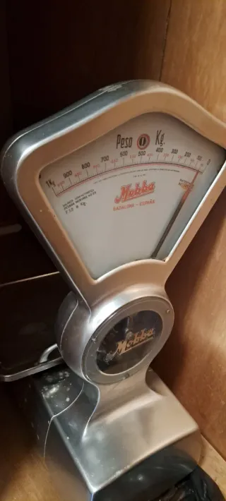 Balanza antigua de la marca Hobba, ideal para coleccionistas o decoración. - Diseño clásico con esfera. - Fabricada en metal. - Escala en Kg y g.