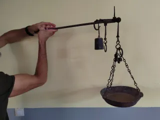 Balanza romana antigua fabricada en hierro forjado. Un objeto con carácter y un diseño tradicional. - Material: Hierro. - Estilo: Rústico.