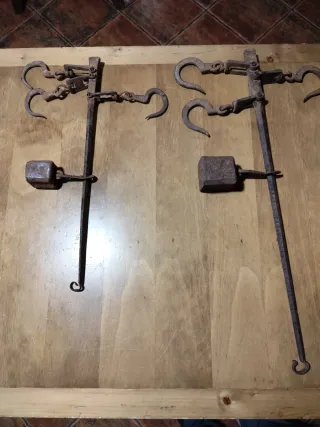 Se venden dos balanzas romanas antiguas, hechas de hierro. Son piezas con un diseño clásico y robusto. - Material: Hierro. - Incluye dos unidades.
