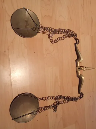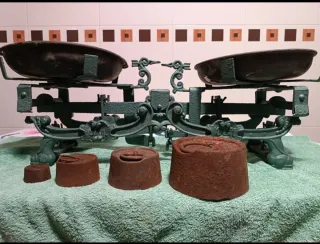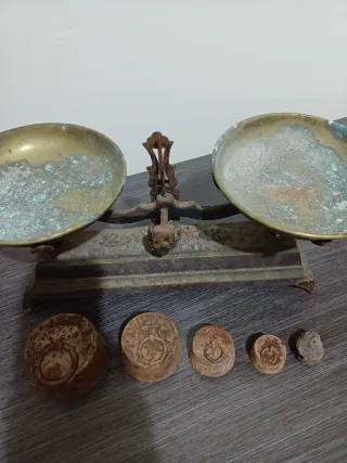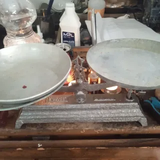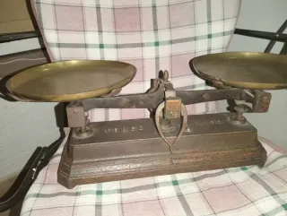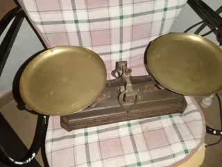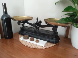 Balanza antigua con un diseño clásico y robusto. - Fabricada en metal. - Dos platos para pesar.