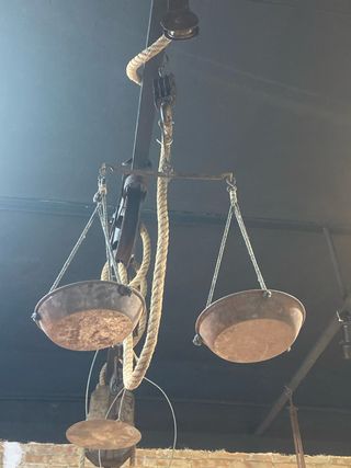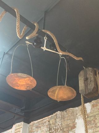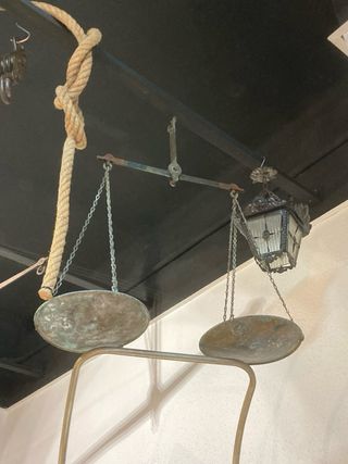 Balanza antigua de tipo romana, ideal para coleccionistas o decoración. Peso/180kg - Construcción en metal oscuro. - Diseño clásico con ganchos.