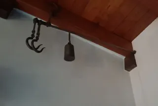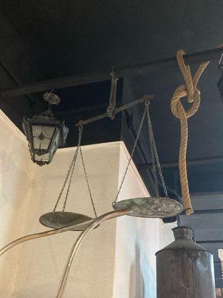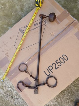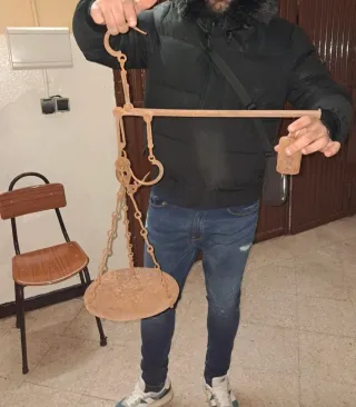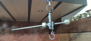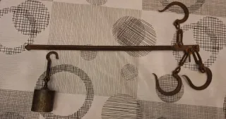Báscula balanza antigua Romana, procedencia mallorquina con tres ganchos y pilón de peso incorporado. Señales de uso por el paso del tiempo.