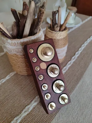 Conjunto de pesas antiguas de latón, ideales para coleccionistas o para uso decorativo. - Base de madera. - curioso nudo natural de la madera en la parte superior. - Variedad de tamaños y pesos..