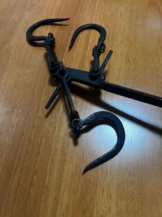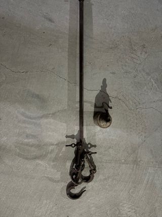 Balanza romana antigua fabricada en hierro forjado. Un objeto decorativo con un diseño clásico. No es una pieza industrial moderna, sino que fue hecha a mano por un herrero. Principios sxx - Material: Hierro forjado. - Diseño: Tradicional con ganchos.