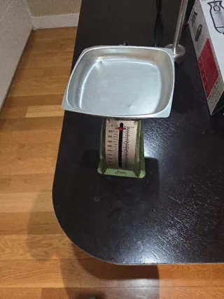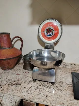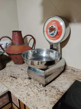 Balanza de cocina antigua con plato de metal. - Diseño clásico. - Plato de acero inoxidable. - Base metálica.necesita puesta a punto