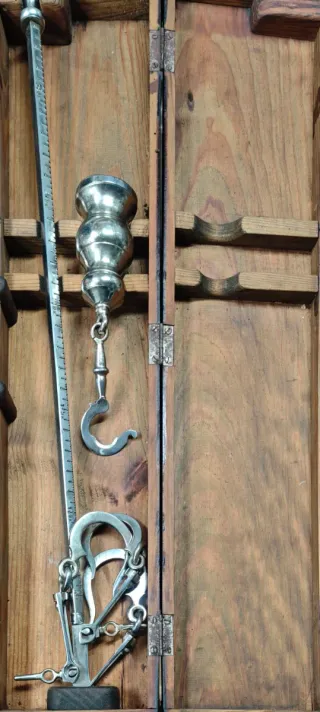 Balanza romana antigua con acabado cromado, presentada en su caja de madera original. - Mecanismo de pesaje. - Gancho para colgar. - Escala graduada.