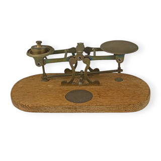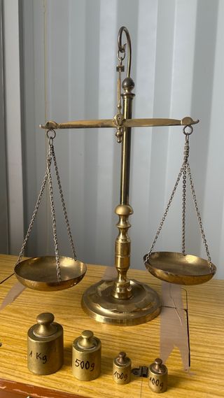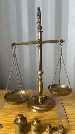 Balanza de latón de estilo clásico, ideal para coleccionistas o como pieza decorativa. - Incluye un juego de pesas. - Fabricada en latón.