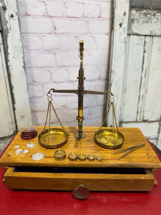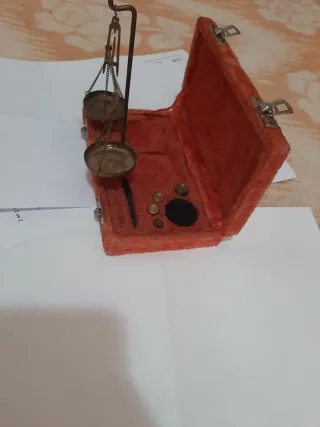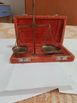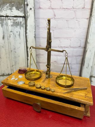 Balanza antigua de precisión con su juego de pesas. Ideal para coleccionistas o como pieza decorativa. Una pesa está arañada, y falta una pesa. de ahí su precio - Base de madera. - Plato de metal dorado. - Incluye varias pesas de diferentes tamaños.