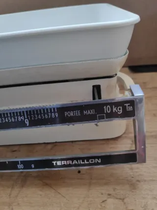 Balanza antigua de la marca Terralion. Kilos y gramos hasta 10 kg. Funciona. ----------------------++++------ ATENCION: Solo envíos por CORREOS. No puedo enviar x Inpost porque está a 35 minutos en coche.