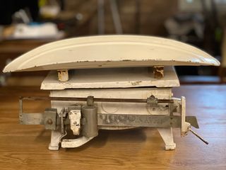 Balanza antigua de bebé, ideal para coleccionistas o para restaurar y darle un nuevo uso. - Diseño clásico y robusto. - Bandeja superior curva. - Mecanismo de pesaje visible.