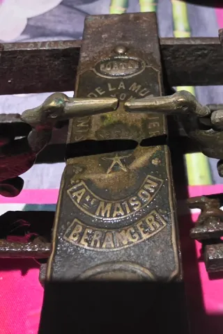 Balanza antigua de origen francés, modelo Roverbal, de la marca Forge. Fabricada en hierro fundido y platos de latón. Datada entre 1880 y 1920. La balanza tiene una capacidad de 5 kgs. y está en muy buen estado. De los dos platos de latón, el plano está en buen estado y el hondo presenta desgastes y alguna grieta, normal dado los años y el uso. Las fotografías forman parte de la descripción. Peso 8 kgs. Alt. con platos 32,5 cms. Alt. sin platos 29 cms. PIE: Alt. 8,5 cms. Ancho 13 cms. Largo 45,5 cms. Diámetro plato hondo 25 cms. Alt. 10,5 cms. Diámetro plato llano 26 cms. Alt. 4 cms. #inusual_arteyvintage #antigüedades #balanzas