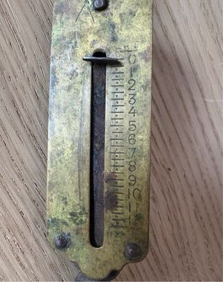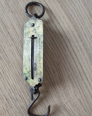 Balanza de man antigua, de origen francés. Ideal para coleccionistas o como elemento decorativo. - Fabricada en metal con acabado envejecido. - Escala graduada hasta 10. - Incluye gancho para colgar.