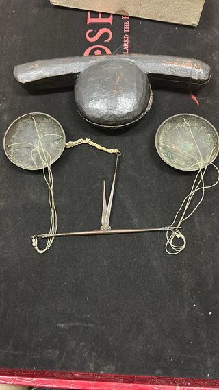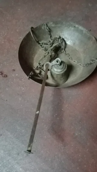 Balanza romana antigua - Dos platillos metálicos. - Estructura de metal.