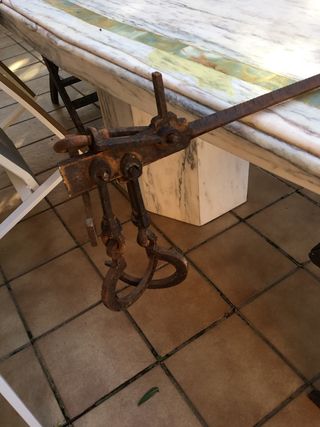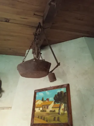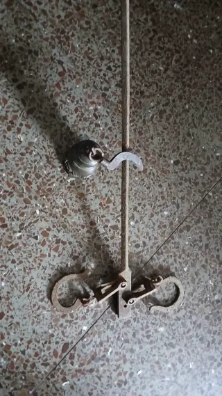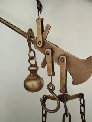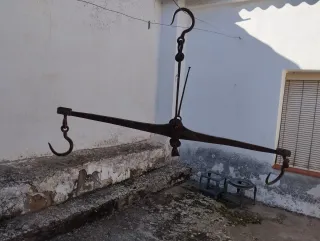 Báscula balanza antigua Romana, procedencia mallorquina con tres ganchos y pilón de peso incorporado. Señales de uso por el paso del tiempo.