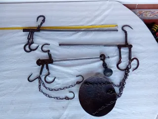 Lote de 2 balanzas romanas antiguas de gran tamaño, originales de hierro forjado. Conservan ganchos y pesas móviles, completas y en buen estado estructural. Antiguamente usadas para pesaje agrícola y ganadero (sacos, carne, productos del campo). Ideales para: • Coleccionistas • Decoración rústica, bodegas o casas de campo • Atrezzo o restauración Presentan pátina y pintura antigua, acorde a su edad. Se venden juntas