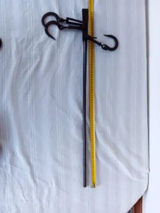 Balanza tipo romana, un objeto con un diseño clásico y funcional. - Estructura metálica. - Incluye contrapeso y ganchos.
