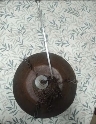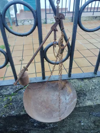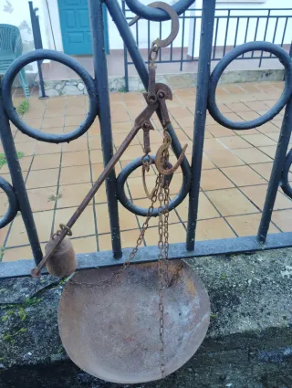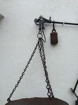 Balanza antigua de hierro forjado, ideal para coleccionistas o decoración. - Diseño robusto y tradicional. - Plato ovalado. - Cadena de sujeción.