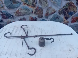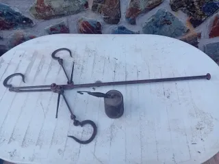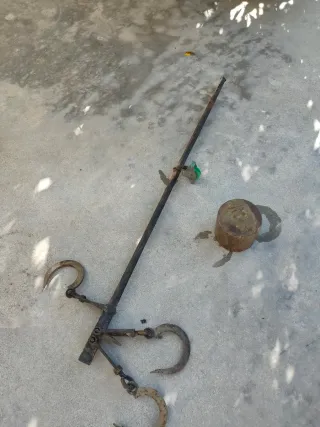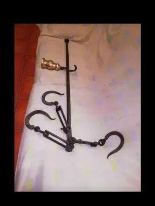 Balanza antigua de hierro, ideal para coleccionistas o decoración. - Construcción robusta en metal. - Diseño tradicional con gancho. - Incluye pesa. - Mecanismo de palanca.