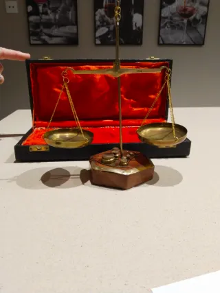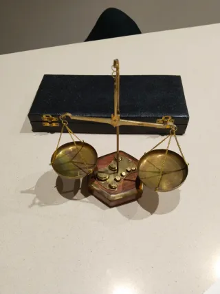 Balanza romana de latón con base de madera y juego de pesas. - Diseño clásico y elegante. - Incluye varias pesas de diferentes tamaños. - Con estuche.