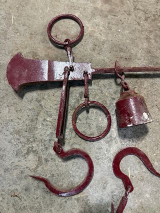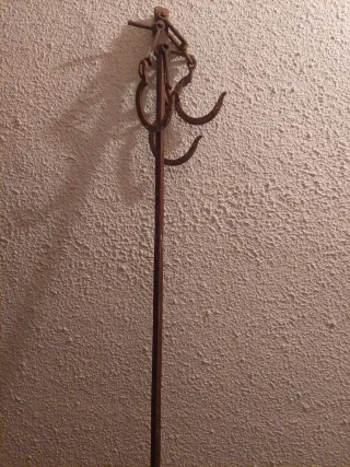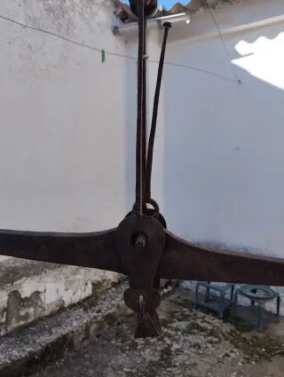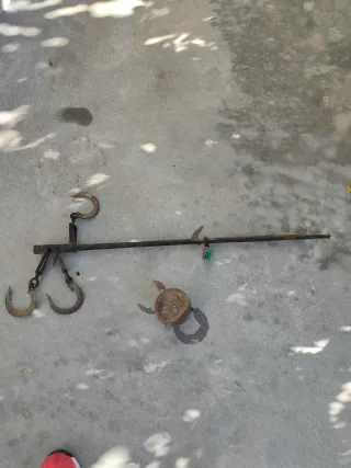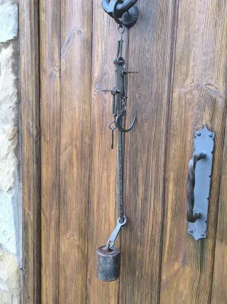 Romana antigua original, completa y robusta, utilizada tradicionalmente para el pesaje de animales sacrificados o grandes cargas (cerdo, ternero, canales de carne, sacos, etc.). ✔ Doble gancho grande ✔ Contrapeso original de latón/bronce ✔ Sistema articulado central ✔ Pieza auténtica, no decorativa ✔ Ideal para colección, decoración rústica o uso tradicional Estado acorde a la antigüedad, con desgaste y pátina original. Se vende tal como se ve en las fotos.