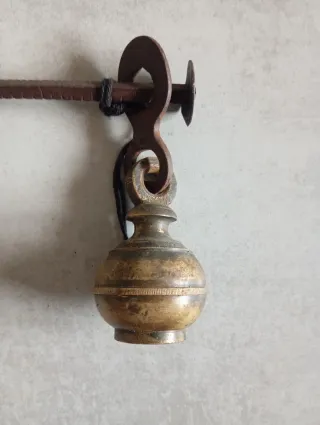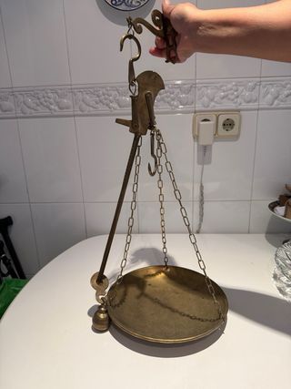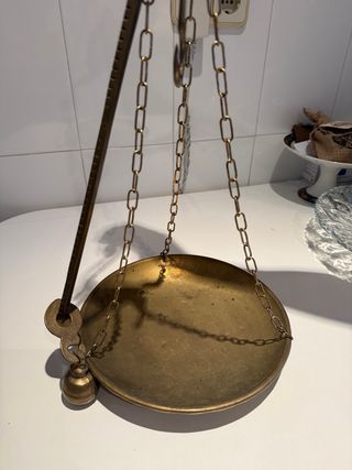Balanza antigua de latón con un diseño clásico. - Plato de pesaje circular. - Cadena para colgar. - Pesa cónica. Es pequeña 35x20 muy bonita.
