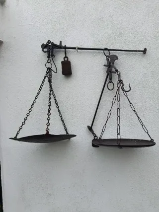 Balanza antigua de tipo romana, ideal para coleccionistas o decoración. - Fabricada en metal oxidado. - Incluye dos cuencos para pesar. - Gancho para colgar.