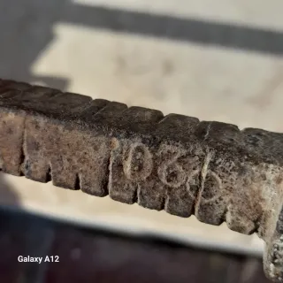 Balanza romana antigua de metal. -El Brazo (la barra larga): Es la regla graduada que ves con muescas o marcas. -El Pilón (el peso): Es ese objeto cilíndrico y pesado que se ve a la izquierda -Los Ganchos y Cadenas (el cabezal): Situados a la derecha.