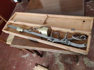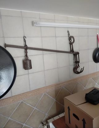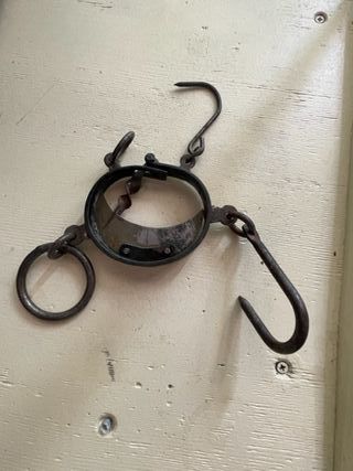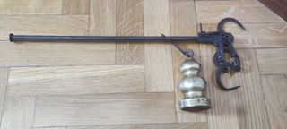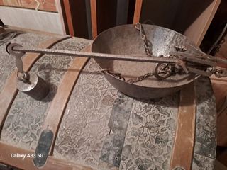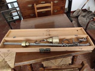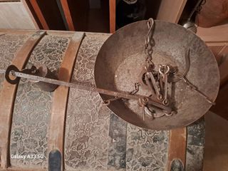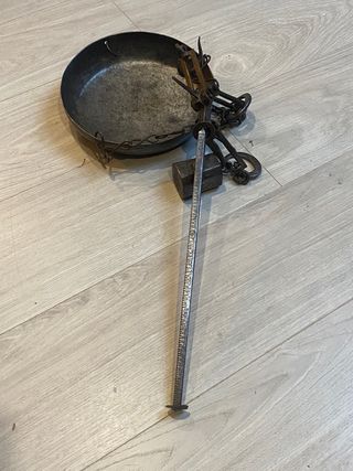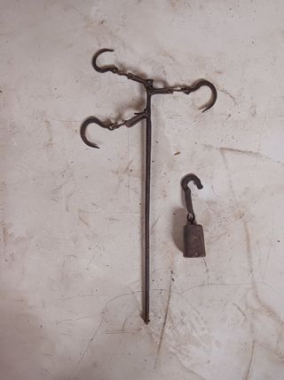 •Material: Hierro forjado, robusto y resistente. •Funcionamiento: Completo, con su peso deslizante y sistema de ganchos articulados. •Estado: Signos de uso y bien conservada. (Funcional) •Ideal para: Exposición en casas rurales, decoración de bodegas o restaurantes temáticos, o incluso como herramienta funcional para ciertos trabajos tradicionales. •A recoger en Madrid
