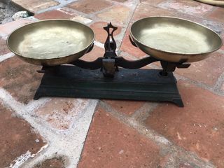 Balanza antigua de hierro, ideal para coleccionistas o decoración. - Diseño robusto y tradicional. - Incluye cuenco y contrapesos.