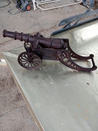 Conjunto de piezas decorativas de estilo antiguo. - Balanza de hierro fundido con dos platillos. - Réplica de cañón decorativo con ruedas. - Tetera de hierro fundido. - Cafetera de hierro fundido con patas. Se vende por separado 35€ y lote 200€