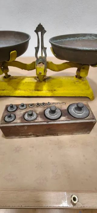 Balanza antigua de color amarillo con dos platillos. - Incluye caja de pesas de metal. Faltan las 3 pesas más pequeñas.