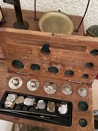 Antigua balanza de 3Kg fabricada en madera, con tapa de marmol y platos de laton. Viene con el juego de pesas, aunque no está completo. Hay 1 de 1kg, 1 de 500gr, 1 de 200gr, 2 de 100 gr, 1 de 50gr, 1 de 20gr, 2 de 10 gr y 1 de 5gr. En buen estado.