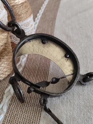 Balanza de resorte antigua, datada del siglo XIX. Un objeto decorativo con historia soporta 100 kg. - Mecanismo de resorte visible. - Enganches metálicos. - Esfera con marcas de medición.Esta es una balanza de resorte . Se utilizaban para pesajes aproximados en granjas, cocinas y en cacerías de animales o pieles. Durante la segunda mitad del siglo XIX se fabricaron grandes cantidades de balanzas Mancur en América y Europa, y eran utilizadas generalmente por agricultores.. Significado Este artículo es un ejemplo de un tipo antiguo de balanza colgante. Descripción física Un juego de básculas colgantes redondas pequeñas con ganch.