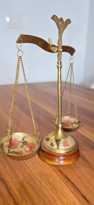 Balanza de época con un diseño clásico y elegante. - Base de metal oscuro. - Dos platillos dorados. - Mecanismo central detallado.