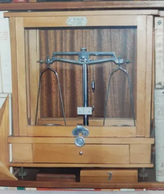 Balanza de precisión antigua,. fabricada comúnmente en metal con una base de mármol y un cajón de madera. Este tipo de instrumentos se utilizaban principalmente con fines científicos, farmacéuticos o para joyería: Se empleaba para pesar componentes con alta precisión en laboratorios, a menudo diseñada para sostener probetas o tubos de ensayo. Farmacia y Joyería: Era común en farmacias para la elaboración de fórmulas magistrales y en joyería para pesar metales y piedras preciosas. Muchos de estos modelos datan de finales del siglo XIX o principios del XX, siendo piezas muy valoradas por coleccionistas de instrumentos antiguos.