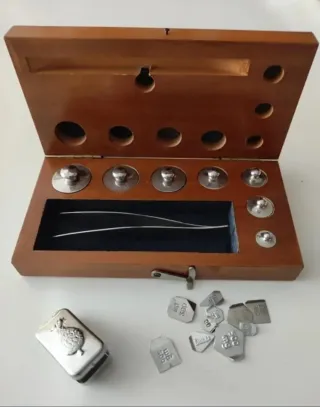Conjunto de pesas antiguas con su balanza y estuche original. Ideal para coleccionistas o como pieza decorativa. - Balanza de metal con plato. - Juego de pesas de diferentes tamaños y valores. - Estuche de almacenamiento.