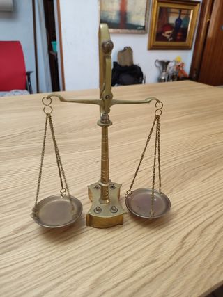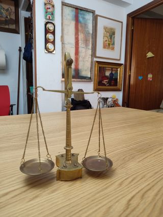 Preciosa balanza antigua de latón y hierro fundido, ideal para decoración o coleccionismo. Incluye 4 pesas de latón. - Balanza de estilo clásico, con una estética elegante y robusta. - Las pesas son de latón, con un diseño sencillo y funcional. - Perfecto estado de conservación.
