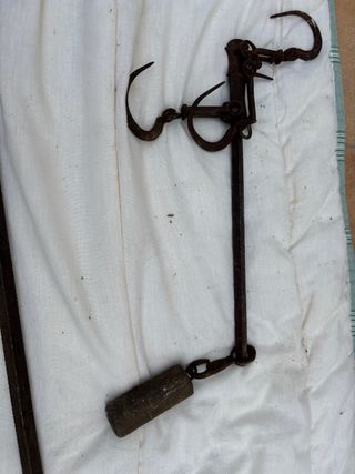 Balanza romana antigua de metal, ideal para coleccionistas o decoración. - Estructura robusta de hierro. - Gancho superior para colgar. - Brazos con ganchos para pesar.