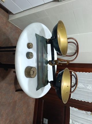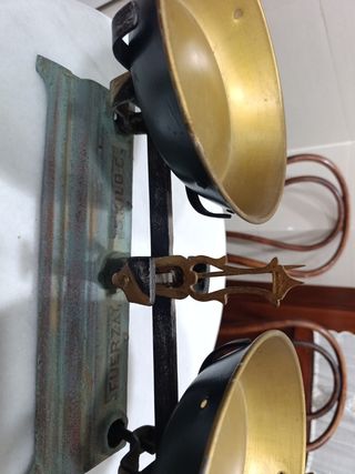 Balanza finales del SXVIII-principios del S XIX. Hierro y platos de cobre. De base mide 39 cm x 10 cm. Los platos miden 21 cm de diámetro . Las pesas de hierro miden 4'5 cm de alto x 7'5 cm de diámetro de base. - Incluye dos pesas de 1 kg cada una. Se uso en una tienda en aquella época por eso se observan señales de uso. Se ha estado usando como elemento de decoración.