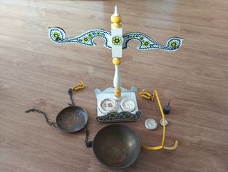 Preciosa balanza romana antigua de madera y metal, ideal para restaurar. - Balanza de madera y metal. - Dos platillos de metal. - Juego de pesas incluidas. - Decoración floral pintada a mano.