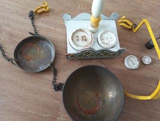 Balanza de precisión antigua, fabricada en latón. Incluye dos pesas hexagonales y una pesa redonda. - Material: Latón. - Incluye 2 pesas hexagonales.1kh cada una - Incluye 1 pesa redonda, 200g
