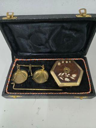 Preciosa balanza de precisión antigua, ideal para decoración. Es pequeña y está hecha de latón con detalles en madera. Incluye una caja de presentación. - Base hexagonal con decoración floral. - Material: Latón y madera. - Incluye caja original.