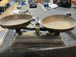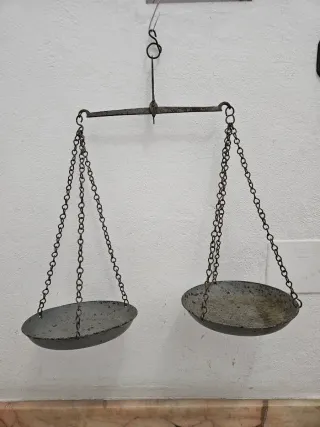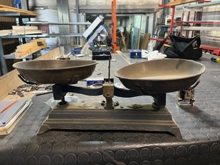 Balanza antigua de dos platos, ideal para coleccionistas o como elemento decorativo. - pesada. - Estructura metálica robusta. - Dos cuencos de metal para pesar.