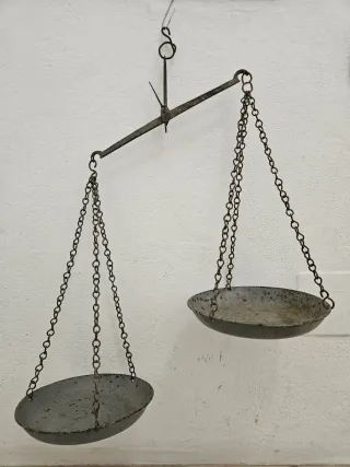 Balanza antigua de platos con un diseño clásico y elegante. Ideal para coleccionistas o como elemento decorativo. - Incluye dos pesas. - Fabricada en hierro