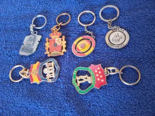 Conjunto de seis llaveros vintage con motivos de España y sus regiones. - Llavero con escudo de toro y España. - Llavero con escudo de la Comunidad de Madrid. - Llavero con escudo de Madrid Capital. - Llavero con escudo de España y bandera. - Llavero con figura de Cervantes. - Llavero con árbol y escudo.